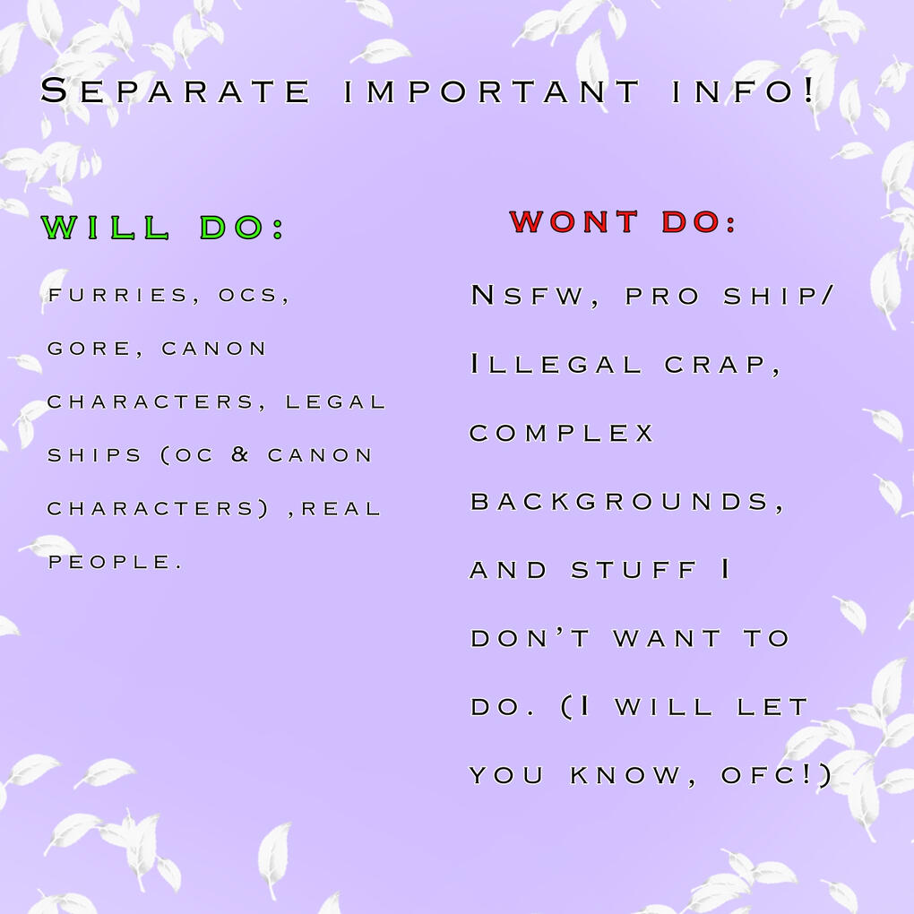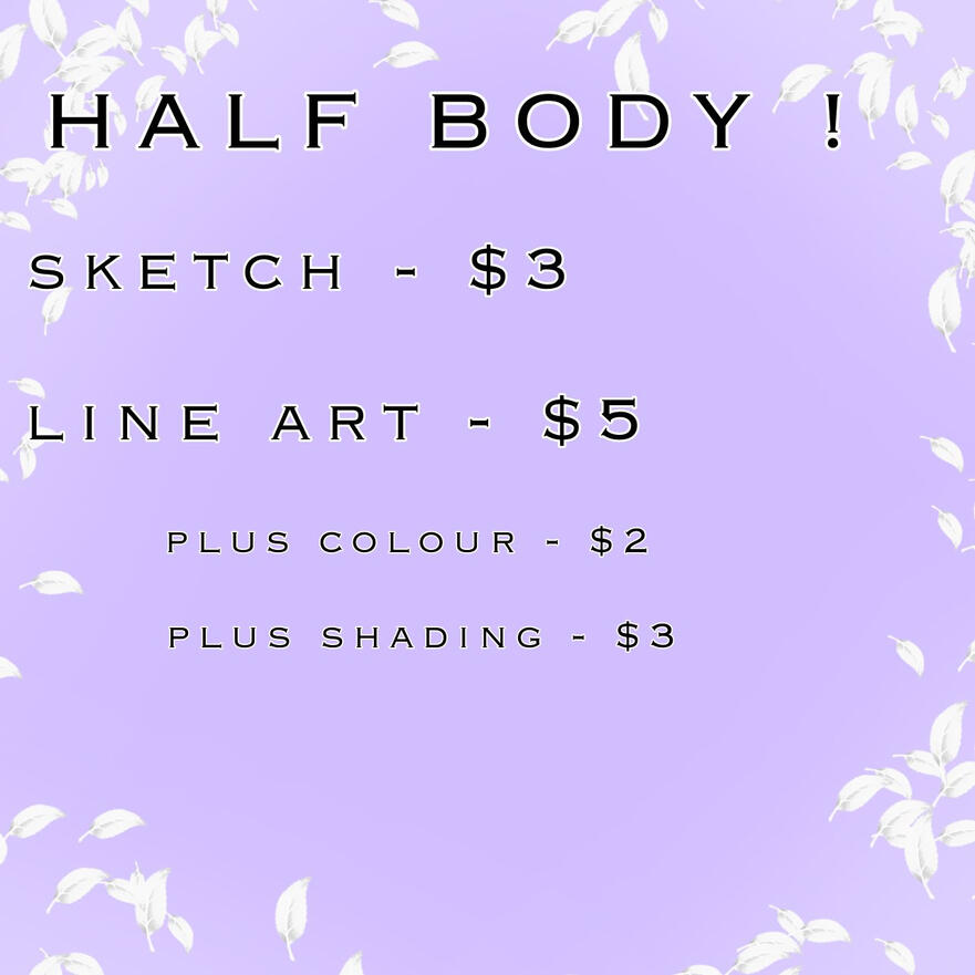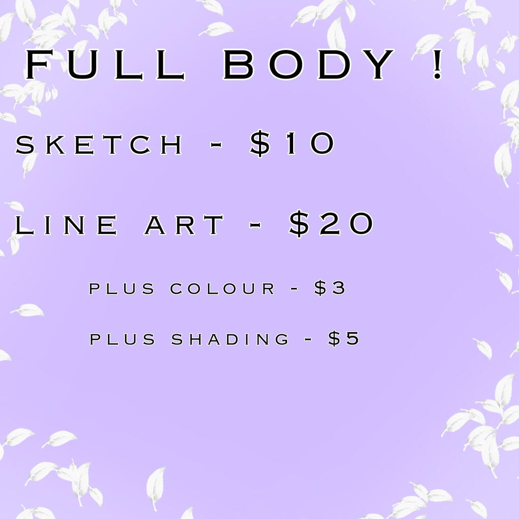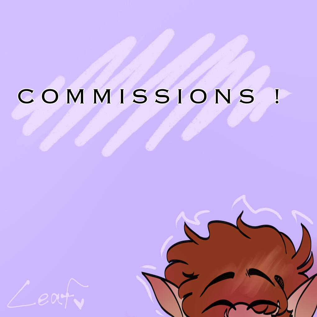 Hello! My name is Leaf and welcome to my commission page! Here you will find my prices, some references of my art, and some dos and donts!